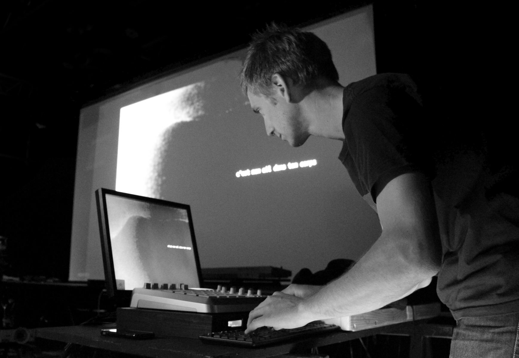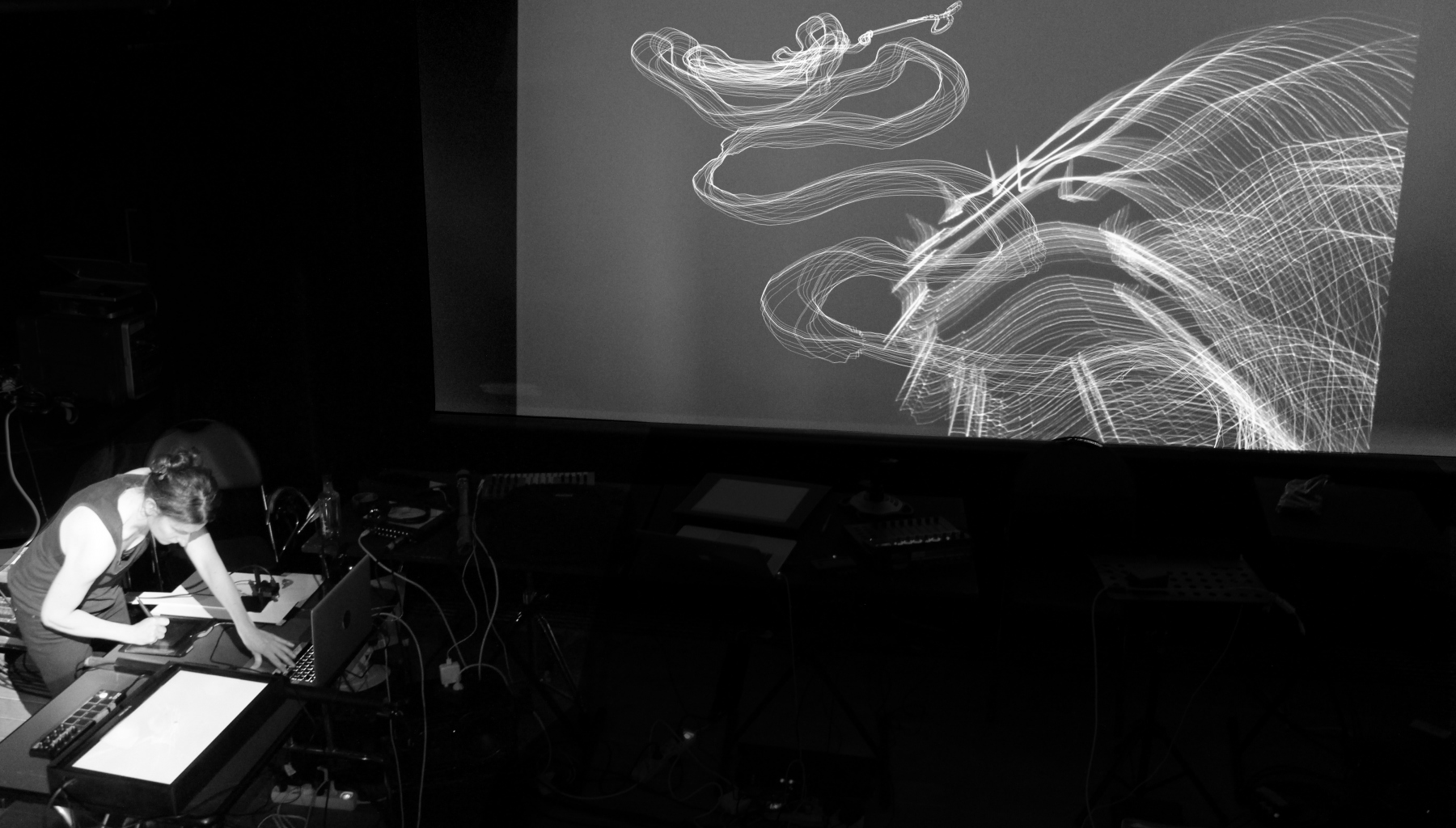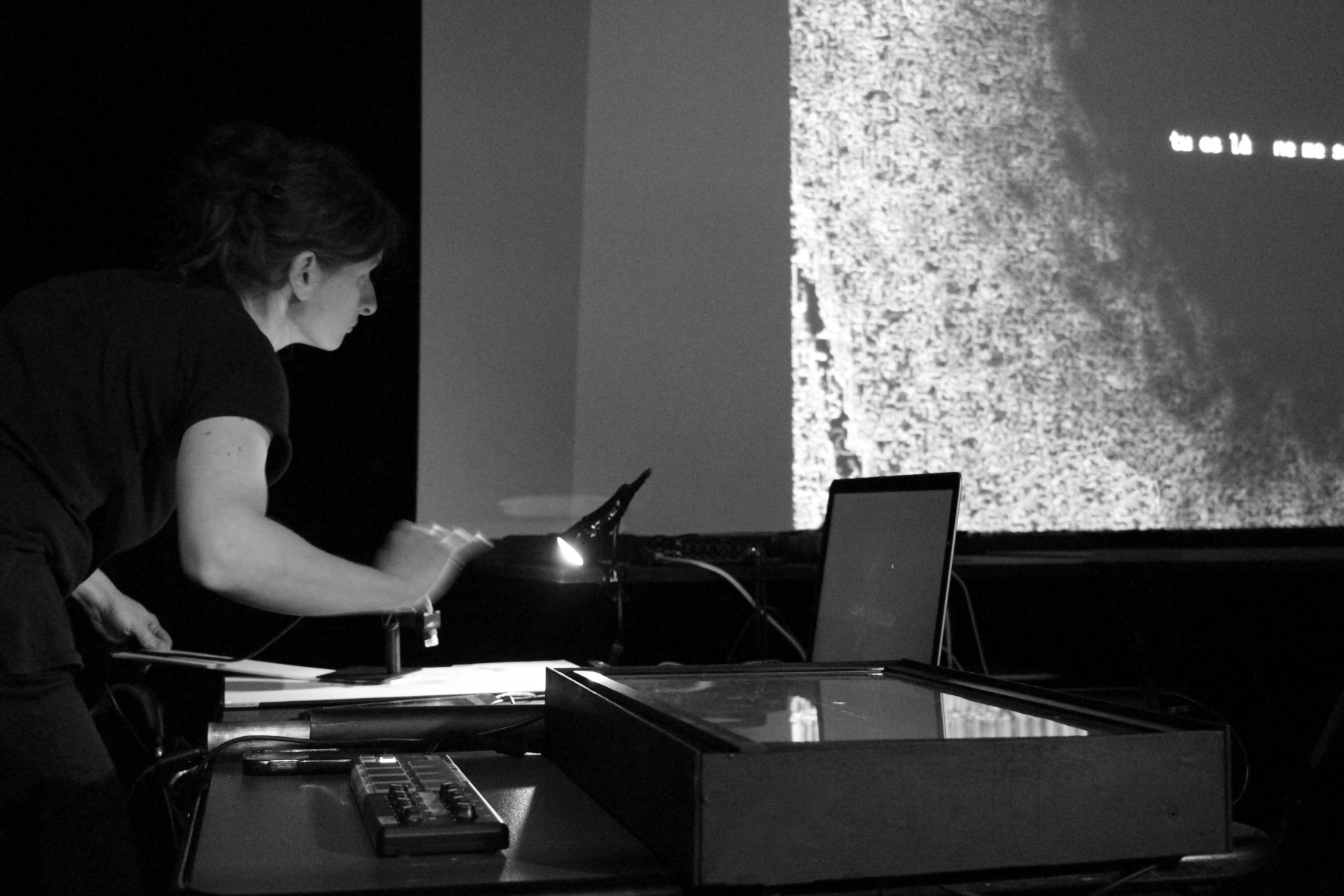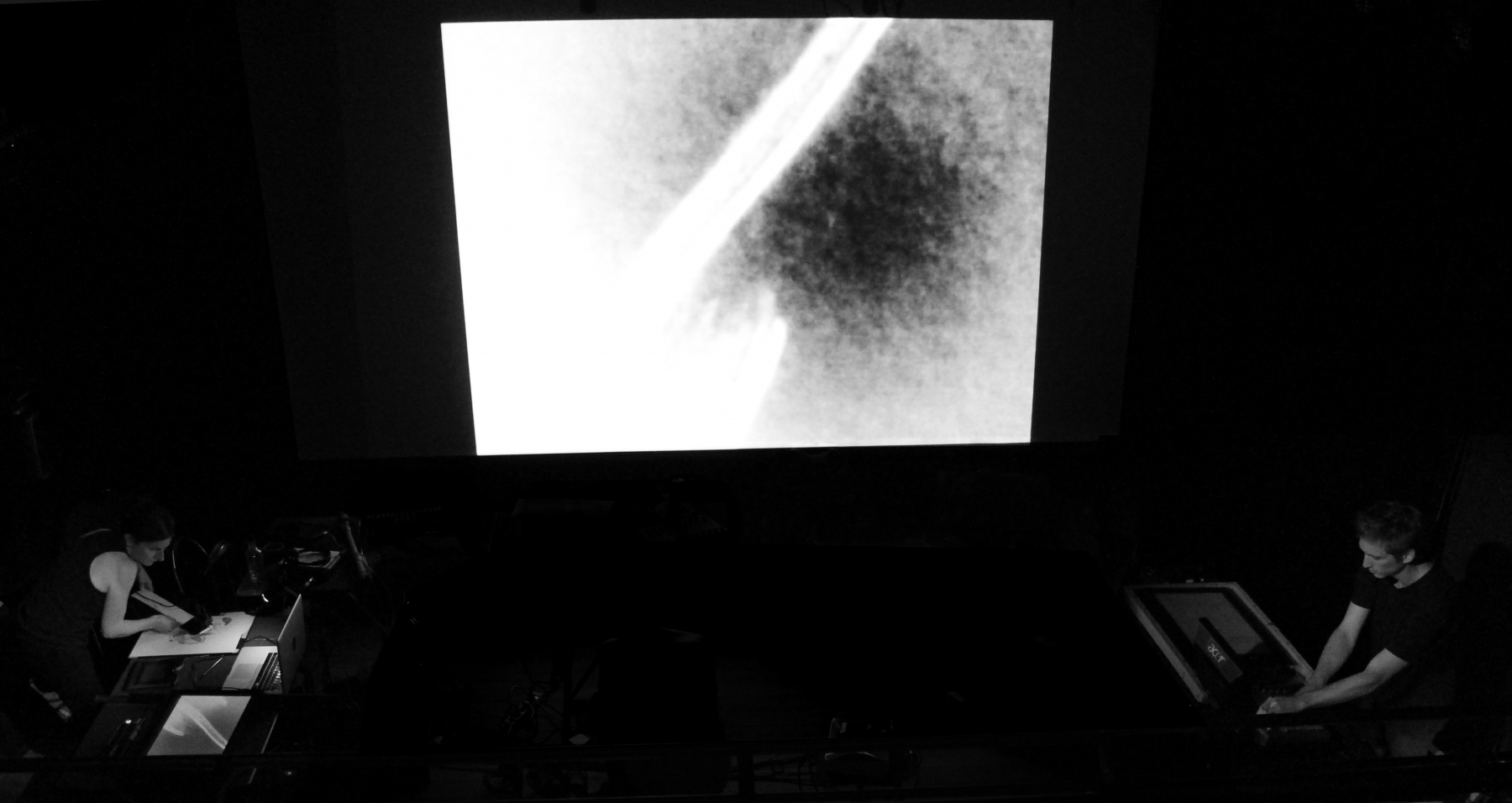 The performance stages a textual, sonic and graphic dialogue, whose terms are caught up in a cycle of metamorphoses embodying the modalities of digital communication. The network acts as a protagonist, an environment with its own rhythm and rules. Manipulations of digital images (via multi-touch interfaces) and analog images (captured via microscope camera and endoscope) are performed on stage in real time. They generate and explore the fiber as an organic environment, in which language, deconstructed then reconstructed, tries to find its way, from sign to poem.